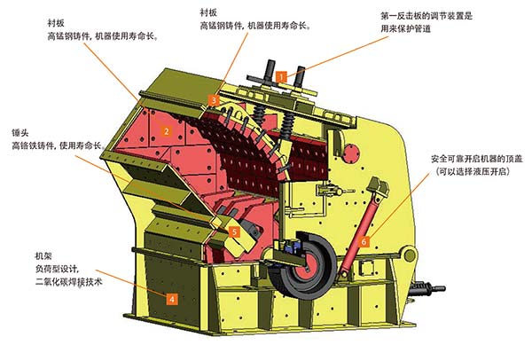 2、長壽命低成本,直線型板錘材質(zhì)是高鉻鑄鐵,帶有軸對稱齒,在一段磨損的情況下可掉頭使用;反擊襯板為折線形設(shè)計(jì),使用視磨損情況可互調(diào)位置,以延長使用壽命,節(jié)約成本。